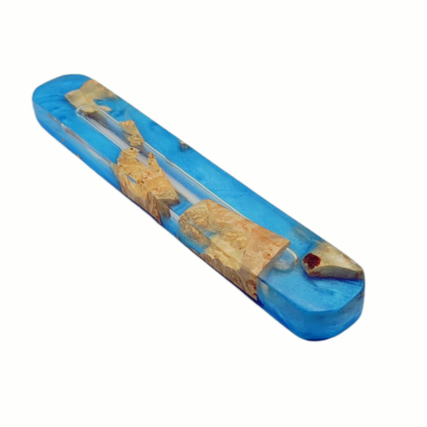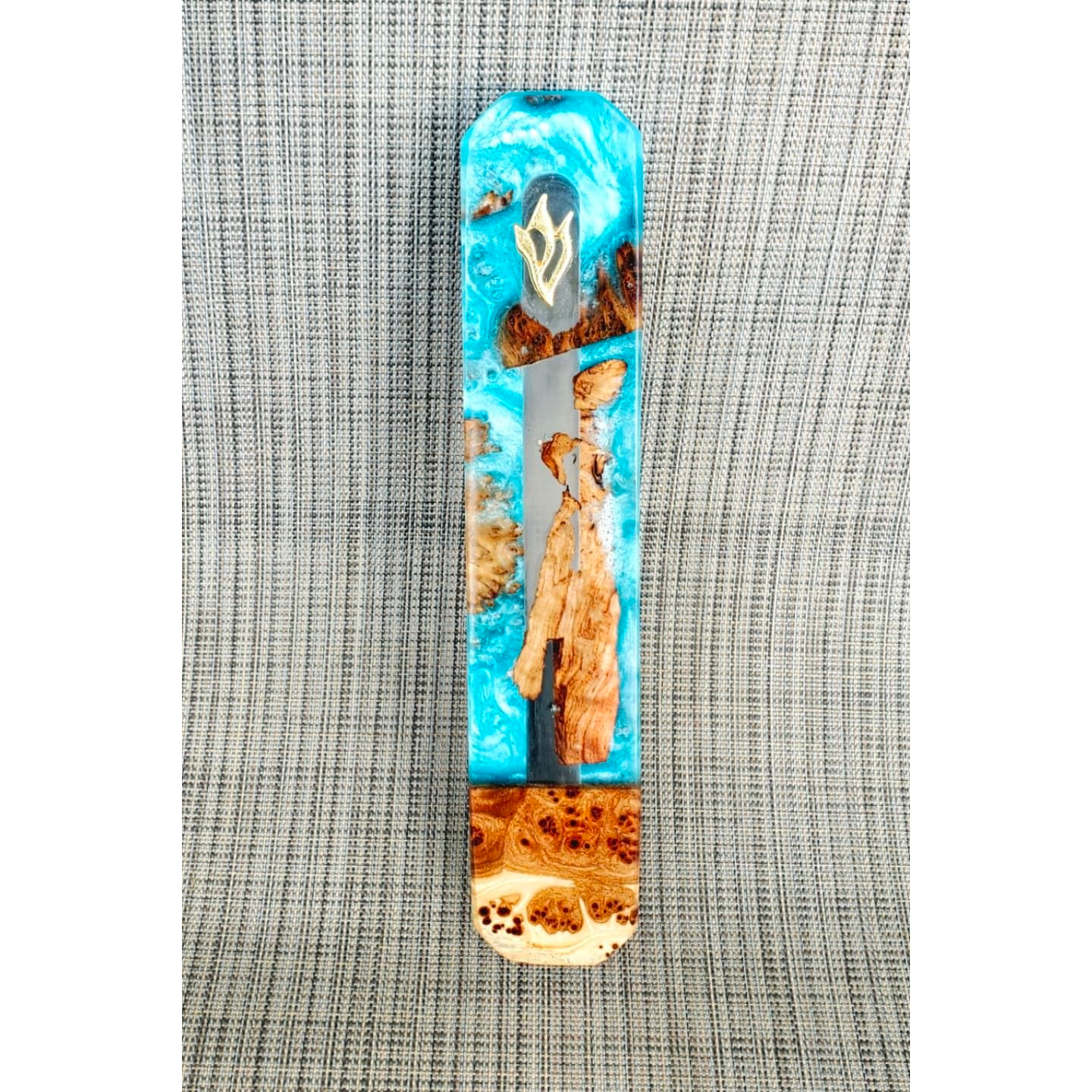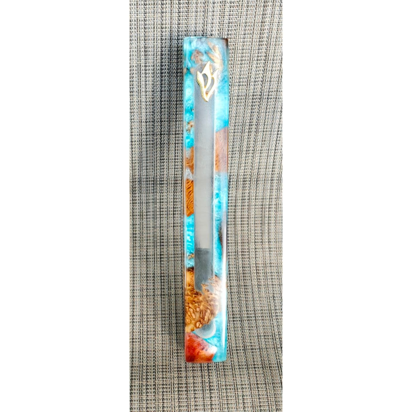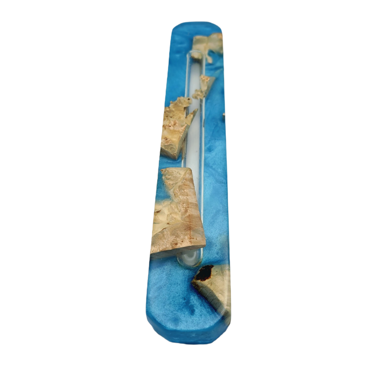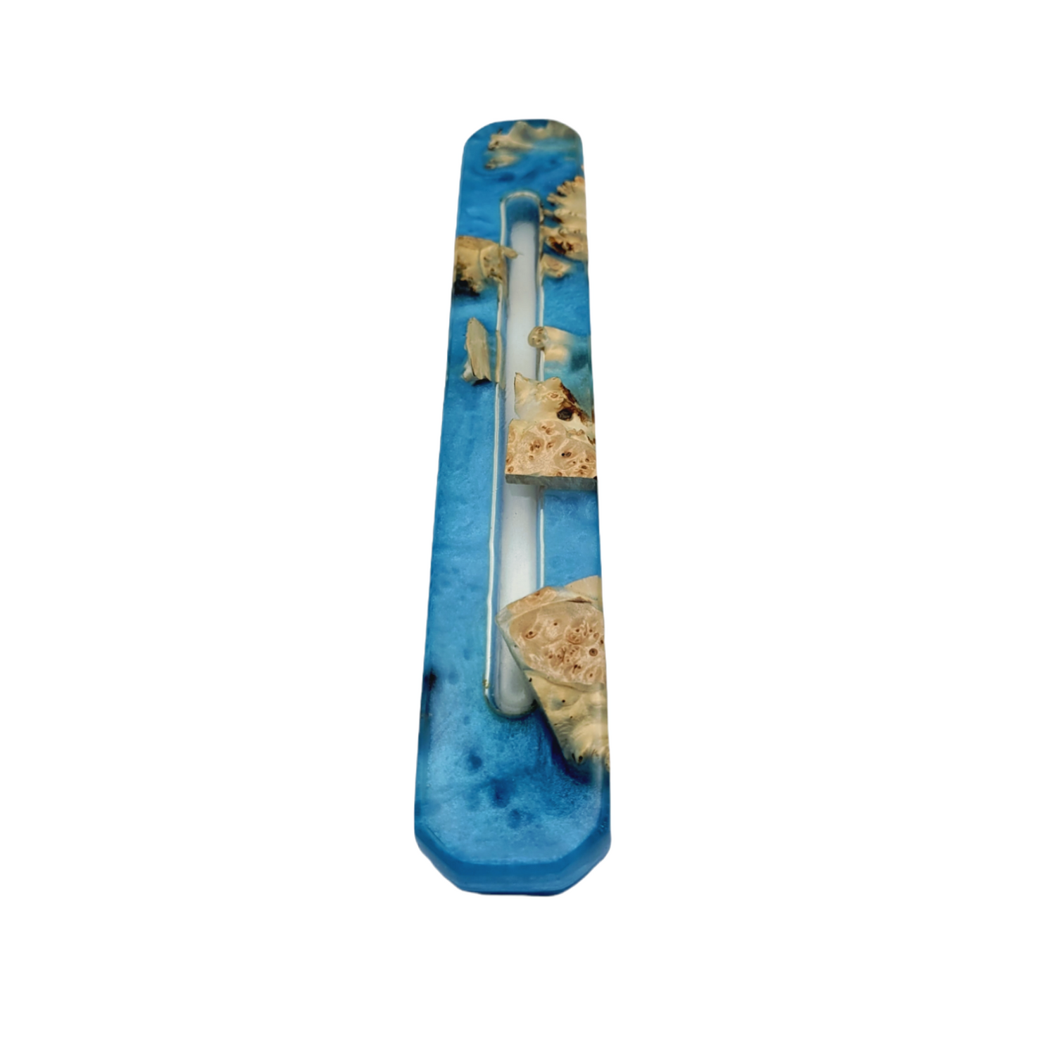 Mezuzah Holder Burl Wood With Blue Epoxy Background and Clear Epoxy