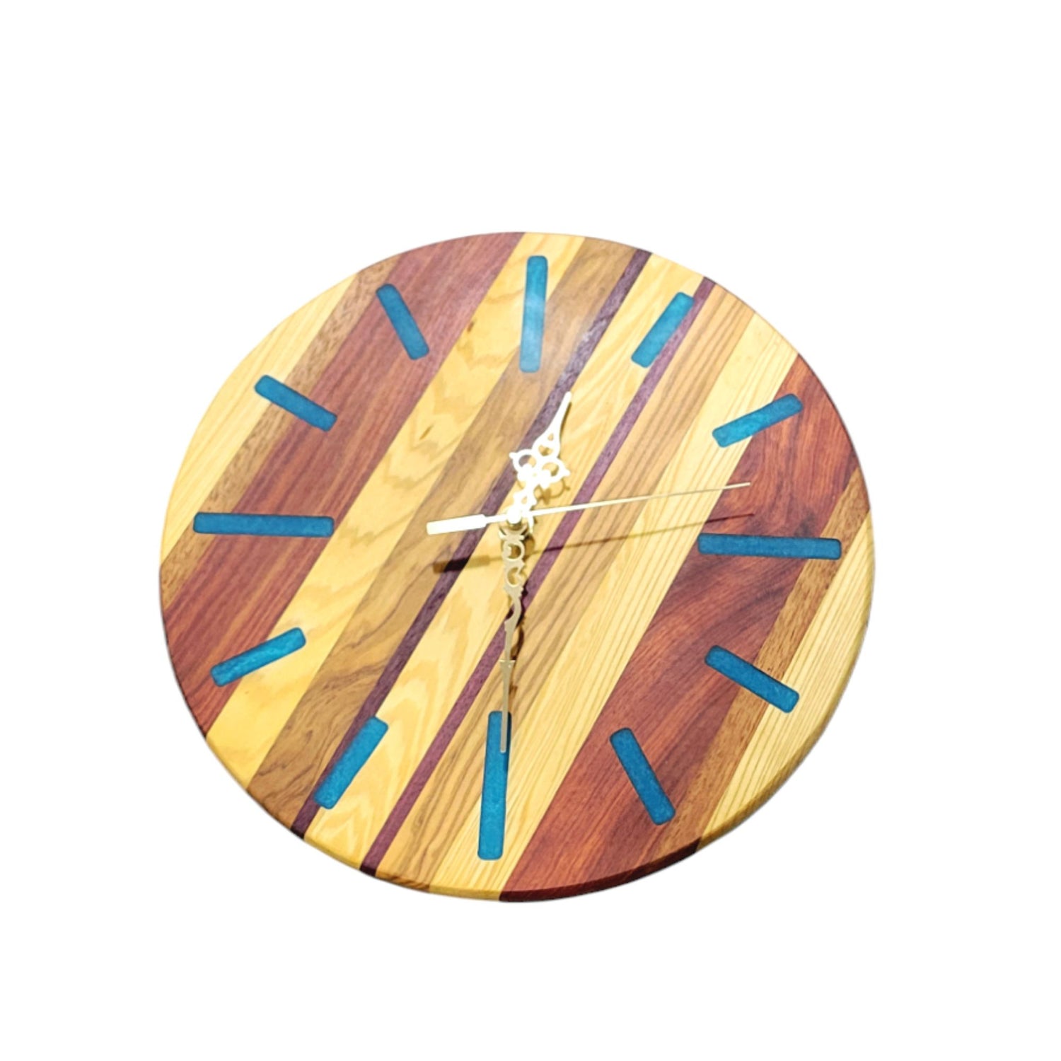 Wall Clock 12" Strips Of Exotic Woods With Blue Epoxy Lines